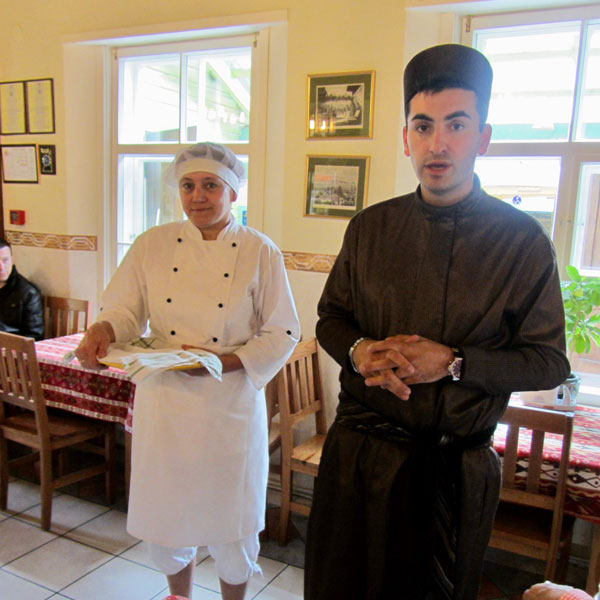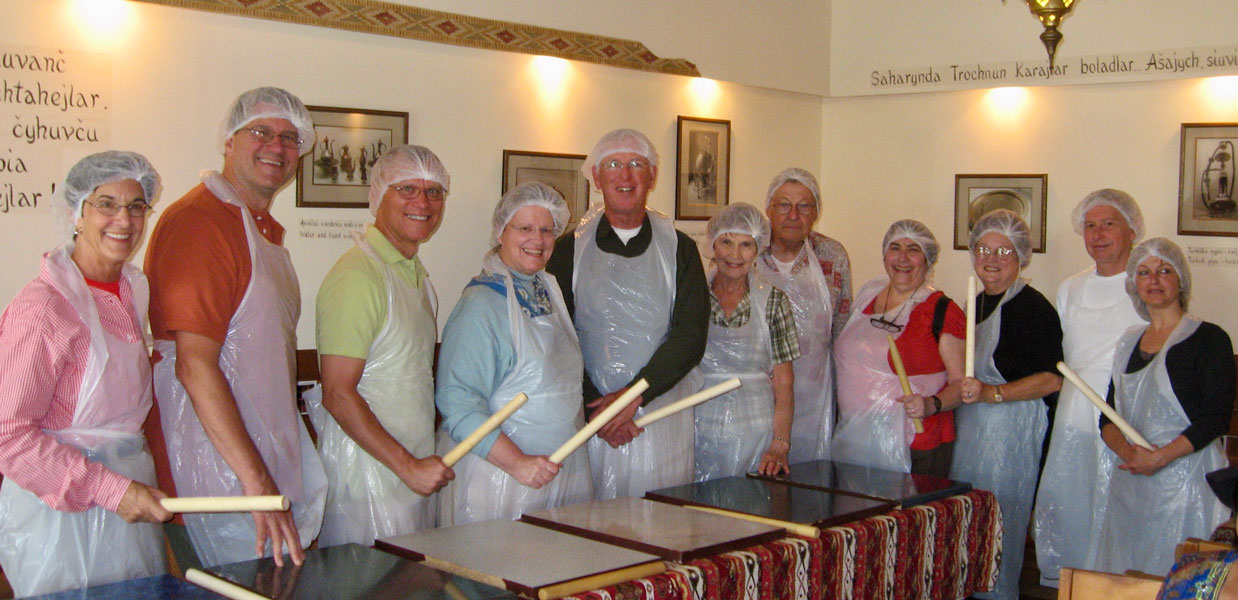 The most famous Crimean Karaite food is Kybyn. Kybynlar (plural) are half-moon shaped pies of leavened dough with a stuffing of chopped beef or mutton, baked in a dutch oven or on a baking sheet. Our group was given a mini-lesson in assembling the meat pies which became our main course for lunch once they were baked. They were delish.